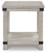 Add a quaint touch of farmhouse style to your living area with this end table. Its beautifully distressed light gray finish enhances the reclaimed wood's natural grain, which delivers a naturally aged feel straight from the countryside. You'll love its generous scale, offering a roomy table top and base shelf that are ideal for displaying accents and more. Large legs, metal accents and the planked effect dress up its country charm._x000D_
