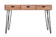 Our Rollins Collection tastefully merges modern style with industrial design to create these stunning occasional pieces. From sturdy rich wood finished drawers to the hairpin legs, this group hits all the right notes for high style in your home. This desk features three drawers and a power unit with standard and USB outlets.