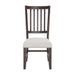 Rich with crisp lines and a rustic look perfectly describes this collection. This collection has a hand wire-brushed finish and square legs. These dining chairs feature slatback detail, an upholstered seat, and hand laid nailhead trim.